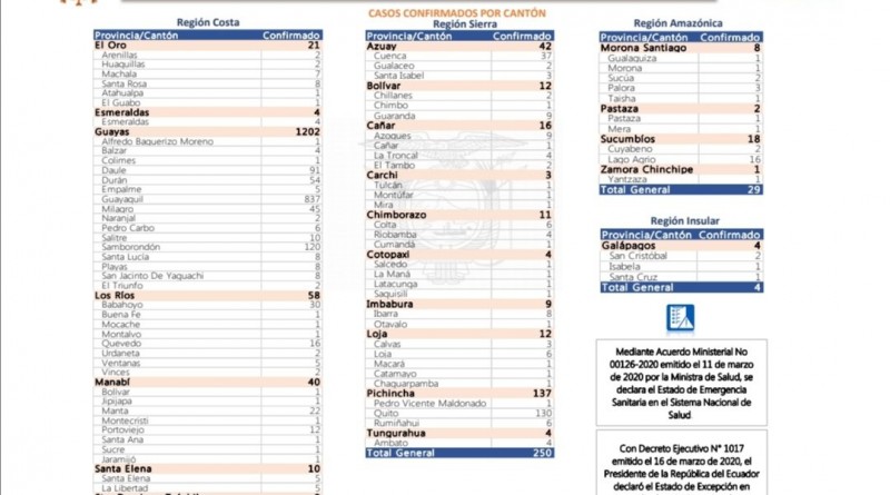 Además, el director de riesgos del Ministerio de Salud, Santiago Tarapués, actualizó la cifra de contagiados a escala nacional. Ecuador cierra este viernes con 1627 casos registrados desde el 29 de febrero.